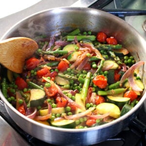 - Sauté the veggies: Meanwhile, in a large skillet, heat the olive oil (or a splash of veggie broth for oil-free) over medium heat. Add the onion and zucchini. Sauté for 3–5 minutes, stirring occasionally, until they begin to soften. Add the tomatoes, asparagus, and garlic, and cook for another 5 minutes, until the veggies are tender and lightly browned. If the skillet gets dry, add a splash of water or vegetable broth as needed to loosen. Stir in the peas and cook for 1 more minute to heat through.
