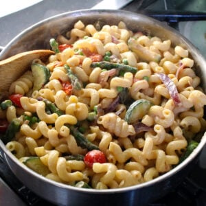 - Combine everything: Add the cooked pasta to the skillet with the veggies. Pour over the sauce and toss to combine. Warm through for 2–3 minutes. If the sauce is too thick, add a splash of reserved pasta water or extra plant milk to loosen.