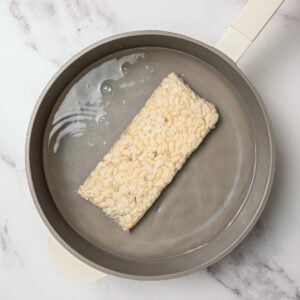 - Simmer the tempeh: Place the whole block of tempeh in a saucepan and cover with water. (Cut it in half if needed to fit.) Bring to a boil, then reduce to a simmer and cook for 10 minutes. This helps mellow any bitterness and makes it easier to slice. Drain and let cool.