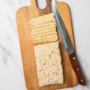 - Slice the tempeh: Once cool enough to handle, slice the tempeh into thin strips, about ¼ inch (6mm) thick. Handle gently, tempeh can be crumbly.