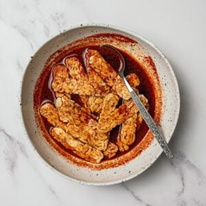 - Marinate the tempeh: In a shallow bowl or container, whisk together the soy sauce, maple syrup, water, smoked paprika, garlic powder, and liquid smoke. Add the tempeh strips, making sure they’re mostly submerged. Cover and refrigerate for at least 1 hour, or overnight for best flavor. (You can marinate for up to 3 days.)