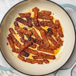 This easy tempeh bacon is crispy, smoky, and packed with plant-based protein. It's the perfect vegan bacon alternative for breakfast sandwiches, BLTs, or to crumble over salads. The key to getting that irresistible chewy texture and deep bacon flavor? A quick simmer to remove the bitterness, a bold smoky marinade delivers flavor, and a light cornstarch coating takes the crisp to the next level. Cook it up in a pan, oven, or air fryer, your choice!