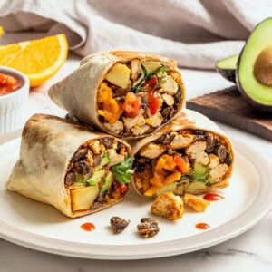 These Vegan Breakfast Burritos are hearty, satisfying, and totally customizable! Packed with crispy potatoes, tofu scramble, black beans, and melty vegan cheese, theyโre the ultimate make-ahead breakfast. Perfect for busy mornings, just grab one from the freezer, heat, and go!