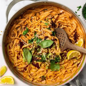 This vegan Marry Me Pasta is so rich, flavorful, and satisfying, it just might inspire a proposal. Hot pasta is tossed in a luscious, creamy cashew sauce infused with garlic, sun-dried tomatoes, tomato paste, and fresh basil for a lucious, romantic dish that feels indulgent but comes together in just 30 minutes. Itโs easy enough for a weeknight and impressive enough for date night. Creamy, comforting, and 100% dairy-free, this pasta is the one.